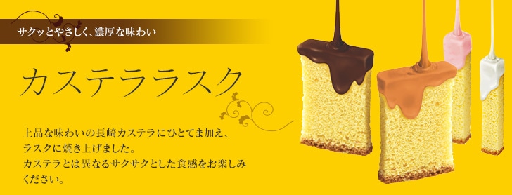 サクッと焼き上げたカステララスクにひと手間加えました。ビター、ホワイト、ストロベリー、キャラメルの4種類。選べる美味しさイロイロです。