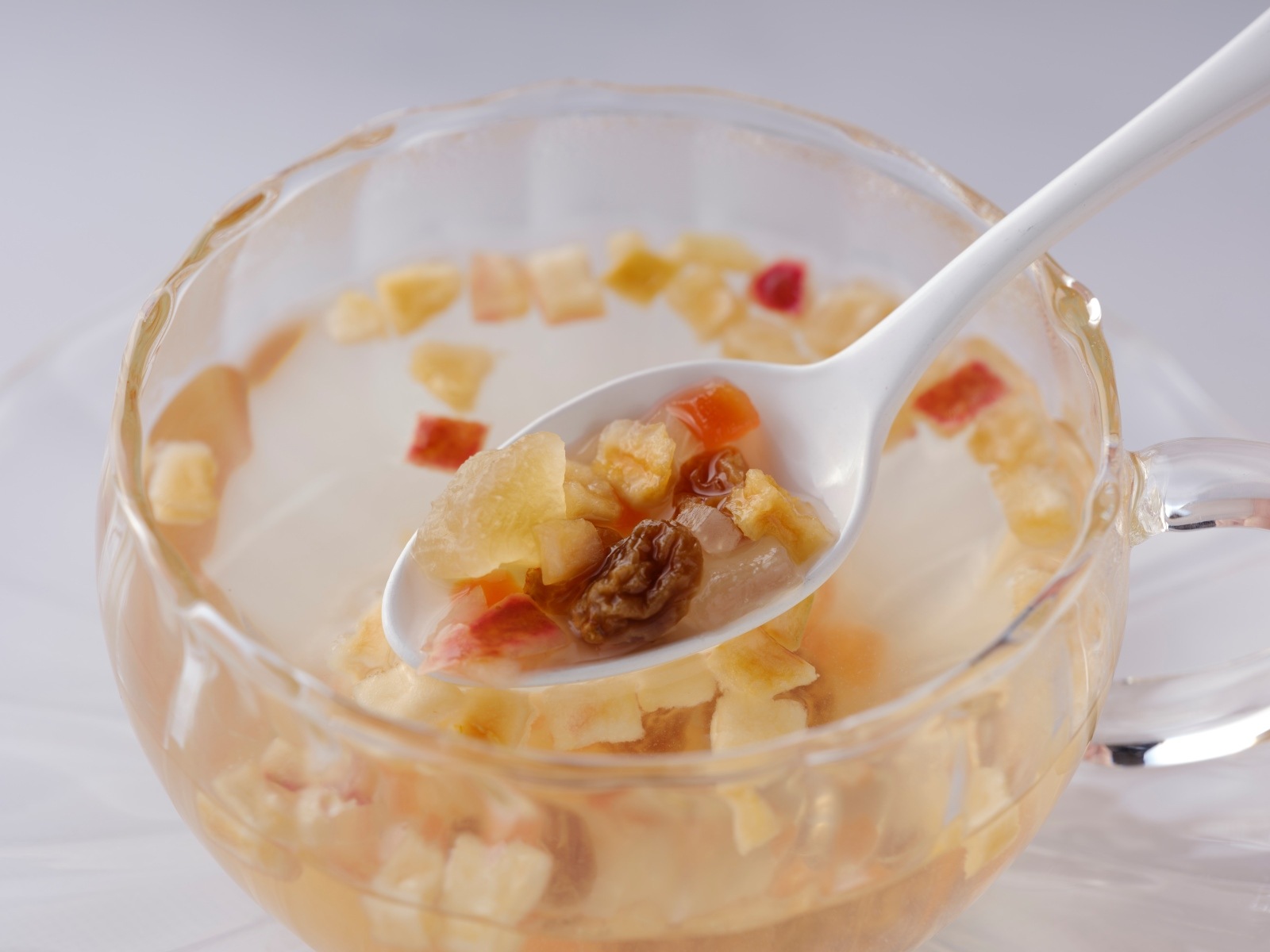 大さじ山盛り1杯をカップに入れ、熱湯を注ぎます。5分ほど蒸らし、軽く混ぜてからフルーツも一緒にお召し上がりください。