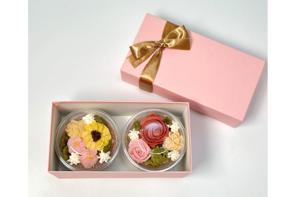 鹿児島産知覧抹茶とほうじ茶のゼリーと鹿児島県鹿屋市産姫小豆の二層に知覧抹茶、ほうじ茶、きなこなどのあんこを使用しひまわりや薔薇のお花を一つ一つ 職人が製作した、かわいいあんみつです♪