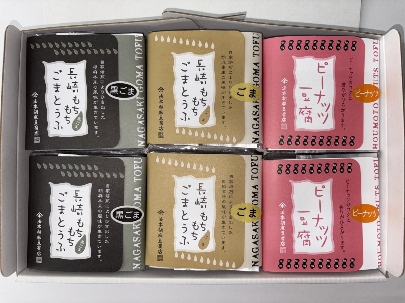 | 内容量 | ■胡麻とうふ:胡麻とうふ 100g、黒蜜 10g、きな粉 5g ■黒胡麻とうふ:黒胡麻とうふ 100g、黒蜜 10g、きな粉 5g ■ピーナッツとうふ:ぴーなっつとうふ 100g、黒蜜 10g、きな粉 5g 各2個入り |